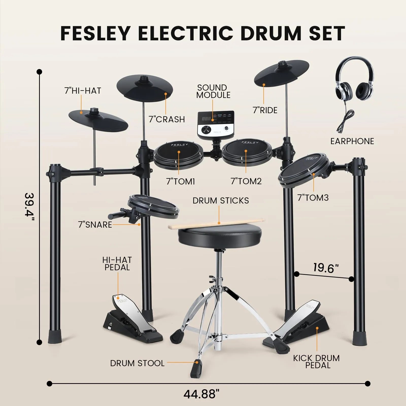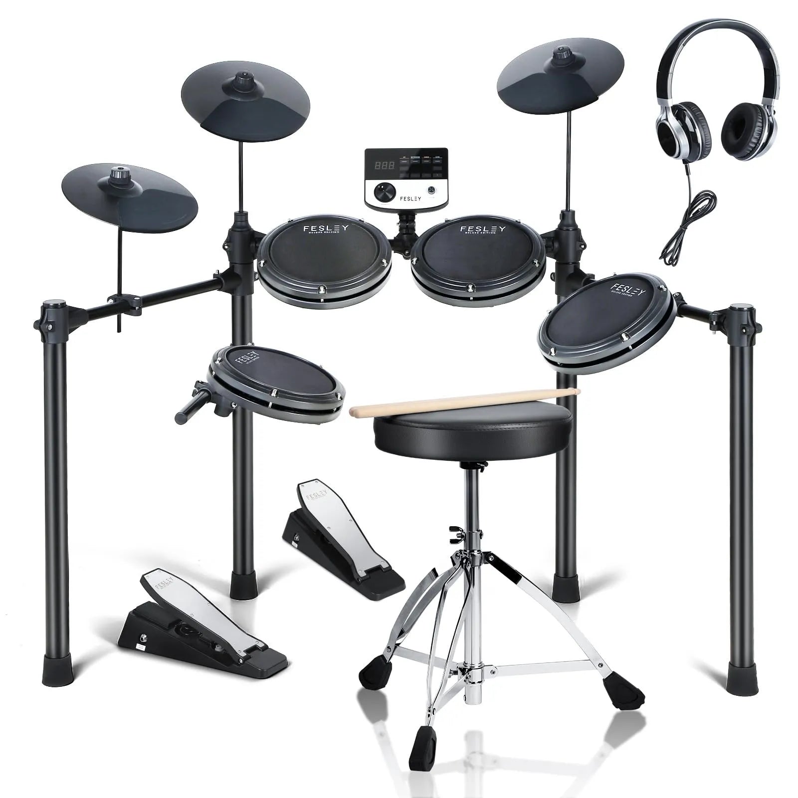 Batería Electrónica Fesley FED200 – 4 Pads de 8″ + 3 Cymbals de 10″, USB-MIDI, Monitor Metronomo y Hasta 165 Sonidos