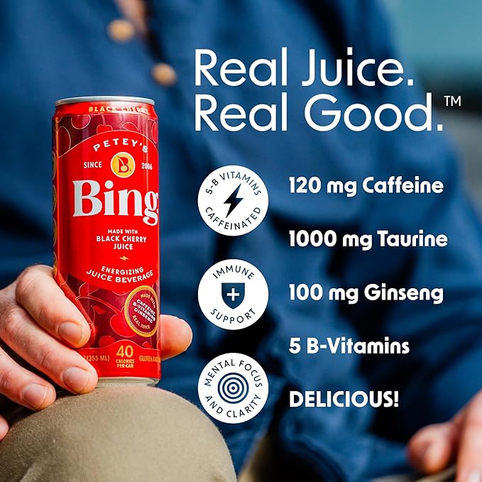 La bebida energética Bing Cherry combina un sabor auténtico a cereza negra con ingredientes funcionales para darte un impulso natural y delicioso. Cada lata está elaborada con jugo real de cereza negra, y su fórmula incluye 120 mg de cafeína, 100 mg de ginseng panax, 1000 mg de taurina, y 5 vitaminas del grupo B para apoyar tu energía y enfoque.
