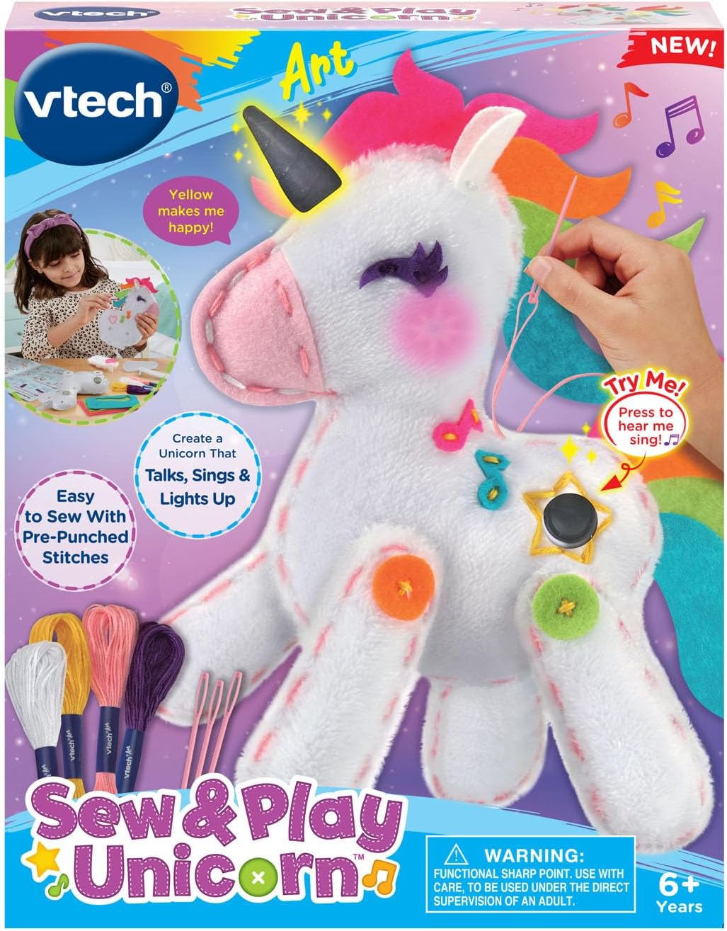 Este unicornio mágico de VTech permite a los niños crear su propia criatura bordada utilizando piezas de tela precortadas y una aguja de plástico segura. Una vez armado, el unicornio interactúa con sonidos y luces: agítalo para que cante, presiona botones para escuchar canciones sobre colores, y observa cómo su cuerno, mejillas y vientre se iluminan en un arcoíris. Ideal para niños creativos que quieren aprender técnicas básicas de costura mientras juegan.